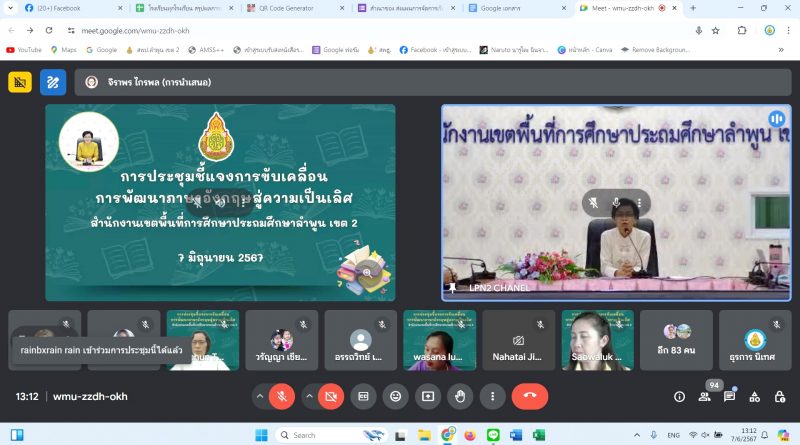 เมื่อวันศุกร์ที่ 7 มิถุนายน 2567 เวลา 13.00 น. ดร.กุลชนกนันท์ ธนโชติกิจเกื้อกูล รอง ผอ.สพป.ลำพูน เขต 2 พร้อมด้วย คณะศึกษานิเทศก์ สพป.ลำพูน เขต 2 เข้าร่วมการประชุมปฐมนิเทศโครงการพัฒนาทักษะการจัดการเรียนรู้ภาษาอังกฤษ โครงการโรงเรียนคุณภาพตามนโยบาย “1 อำเภอ 1 โรงเรียนคุณภาพ” โดยมี นางสาวดวงใจ ถวิลไพร ผอ.สพป.ลำพูน เขต 2 เป็นประธานเปิดประชุม เพื่อส่งเสริมความสามารถทางภาษาของนักเรียนตามกรอบมาตรฐาน CEFR สำหรับโรงเรียนคุณภาพตามนโยบาย “1 อำเภอ 1โรงเรียนคุณภาพ” สอดรับกับนโยบายกระทรวงศึกษาธิการด้านลดภาระนักเรียนและผู้ปกครองเรียนได้ทุกที่ ทุกเวลา (Anywhere Anytime) และนโยบาย 1 อำเภอ 1 โรงเรียนคุณภาพ เพื่อการจัดการศึกษาที่มีคุณภาพ แก้ไขปัญหาความเหลื่อมล้ำทางการศึกษา โดยมีครูผู้สอนภาษาอังกฤษระดับชั้นป. 5 และชั้นป.6 เข่้าร่วมการประชุมผ่านระบบออนไลน์ Zoom Meeting ณ ห้องประชุม 3 สพป.ลำพูน เขต 2