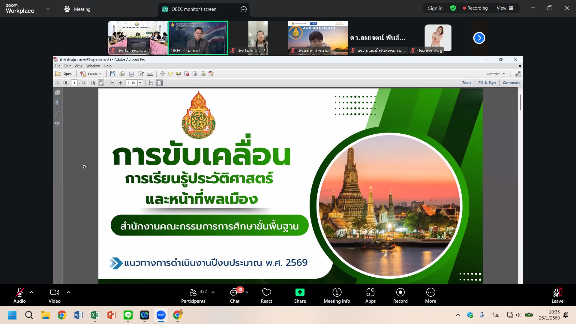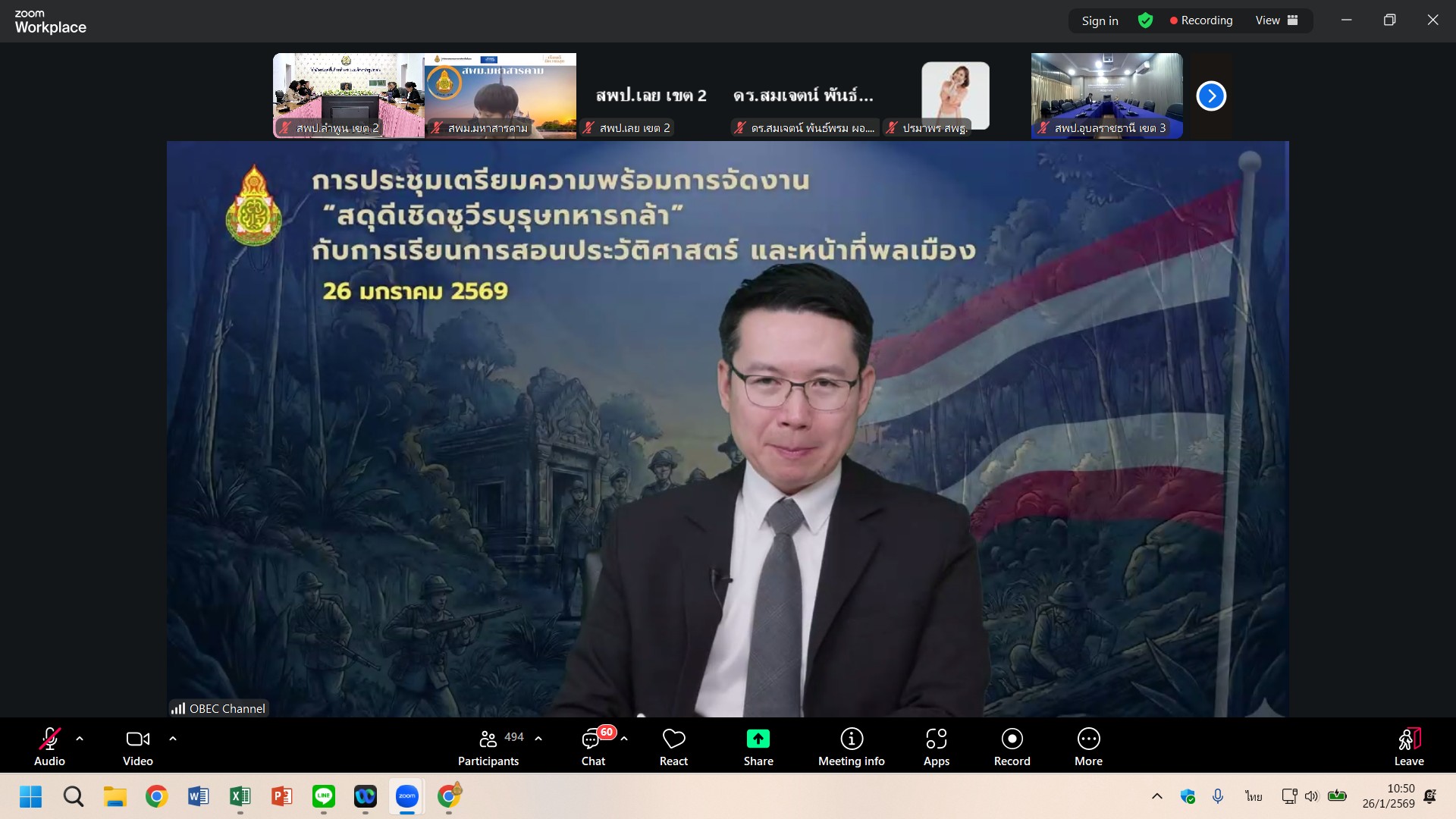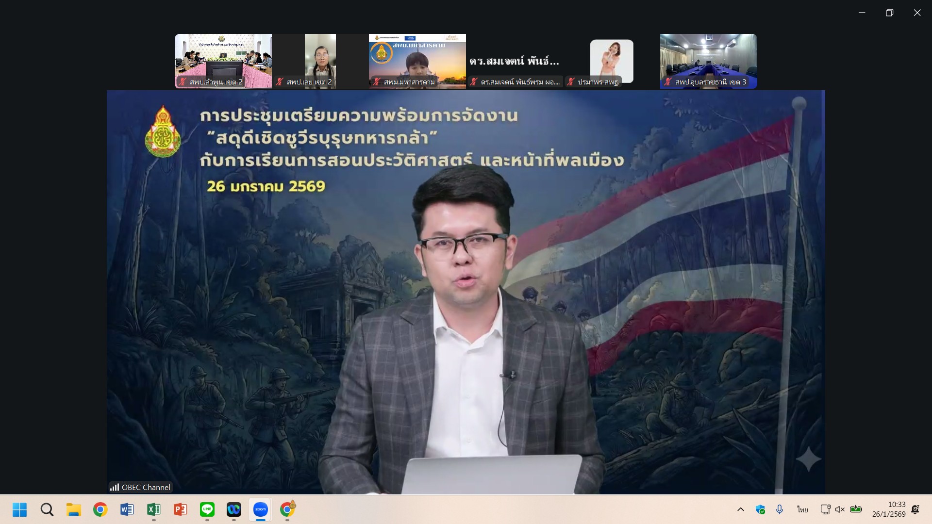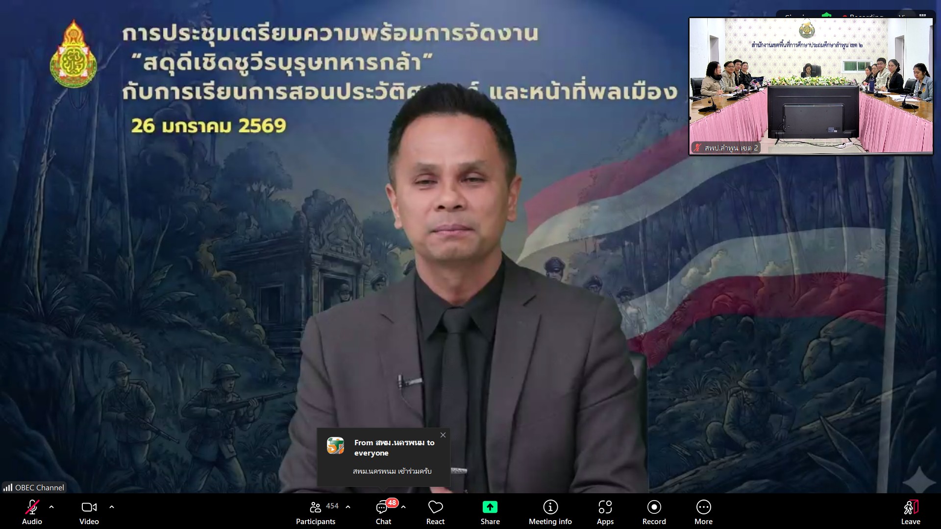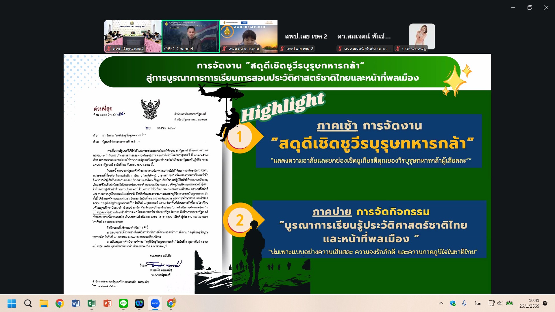 เมื่อวันที่ 26 มกราคม 2569 เวลา 10.00 น. ดร.ดวงใจ ถวิลไพร ผู้อำนวยการสำนักงานเขตพื้นที่การศึกษาประถมศึกษาลำพูน เขต 2 มอบหมายให้ นางสาวอัญชัญ ธรรมสิทธิ์ ผู้อำนวยการกลุ่มนิเทศติดตามและประเมินผลการจัดการศึกษา พร้อมด้วย คณะศึกษนิเทศ สำนักงานเขตพื้นที่การศึกษาประถมศึกษาลำพูน เขต 2 ร่วมประชุมการดำเนินการจัดงาน “สดุดีเชิดชูวีรบุรุษทหารกล้า” ผ่านระบบ Zoom Meetings ณ ห้องประชุม 3 สำนักงานเขตพื้นที่การศึกษาประถมศึกษาลำพูน เขต 2 โดยสำนักวิชาการและมาตรฐานการศึกษา ได้ดำเนินงานโครงการจัดงานนิทรรศการสดุดีดีดีวีรชนแห่งสมรภูมิไทย – กัมพูชา : ความกล้าหาญและหัวใจที่พลีเพื่อแผ่นดิน โดยมีวัตถุประสงค์เพื่อแสดงความอาลัยและรำลึกถึงทหารกล้าผู้เสียชีวิตจากการปะปะบริเวณชายแดนไทย – กัมพูชา อันเป็นการปฏิบัติหน้าที่ด้วยความกล้าหาญและเสียสละชีวิตเพื่อปกป้องอธิปไตยของประเทศชาติตลอดจนเป็นการยกย่องเชิดชูเกียรติคุณของทหารกล้าผู้สละชีพในการปฏิบัติหน้าที่ อันสมควรได้รับการจารึกไว้เป็นแบบอย่างแห่งความเสียสละ ความจงรักภักดี และความภาคภูมิใจของคนไทยทั้งชาติ และเพื่อถอดบทเรียนเพื่อเป็นกรณีศึกษาและตัวอย่างการทำความดี ความเสียสละ และความรักชาติแก่นักเรียน สู่การบูรณาการการจัดการเรียนการสอนประวัติศาสตร์ชาติไทยและหน้าที่พลเมือง และเพื่อขับเคลื่อนโยบายและจุดเน้นของกระทรวงศึกษาธิการและสำนักงานคณะกรรมการการศึกษาชั้นพื้นฐาน ด้านการส่งเสริมคณภาพและคุณลักษณะของผู้เรียนสู่การเป็นพลเมืองที่ดีของประเทศชาติ